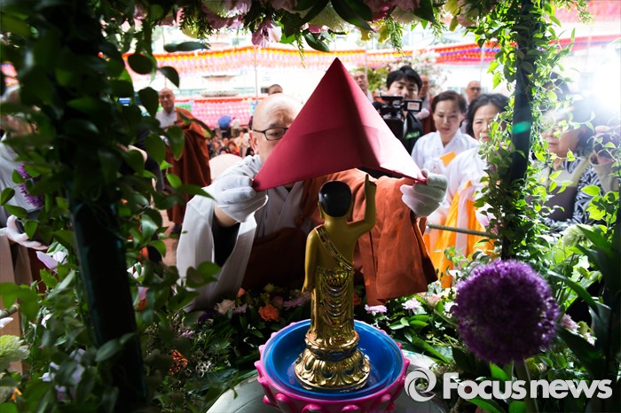 (서울=포커스뉴스) 21일 오전 서울 종로구 조계사에서 관불의식이 열리고 있다. 관불은 불교의식으로 탄생불의 형상에 물을 부어 씻겨 자신의 마음에 쌓인 죄와 번뇌를 맑고 깨끗하게 만들어 복을 누리게 된다고 알려진 의식이다.