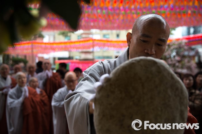 (서울=포커스뉴스) 21일 오전 서울 종로구 조계사에서 금박공양 의식이 진행되고 있다.