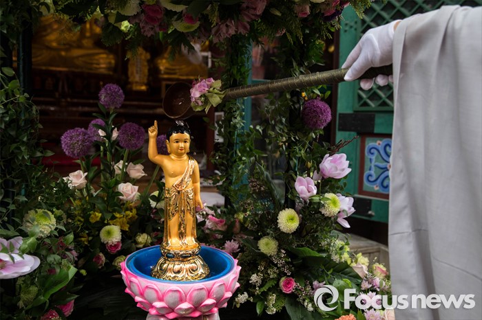 (서울=포커스뉴스) 21일 오전 서울 종로구 조계사에서 관불의식이 열리고 있다. 관불은 불교의식으로 탄생불의 형상에 물을 부어 씻겨 자신의 마음에 쌓인 죄와 번뇌를 맑고 깨끗하게 만들어 복을 누리게 된다고 알려진 의식이다.