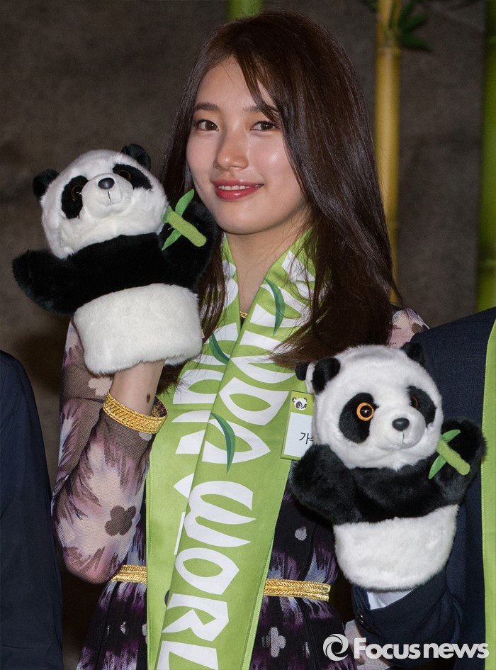 (용인=포커스뉴스) 21일 오전 경기도 용인시 에버랜드에서 열린 '판다월드 개관식'에서 미쓰에이 수지가 기념촬영을 하고 있다.