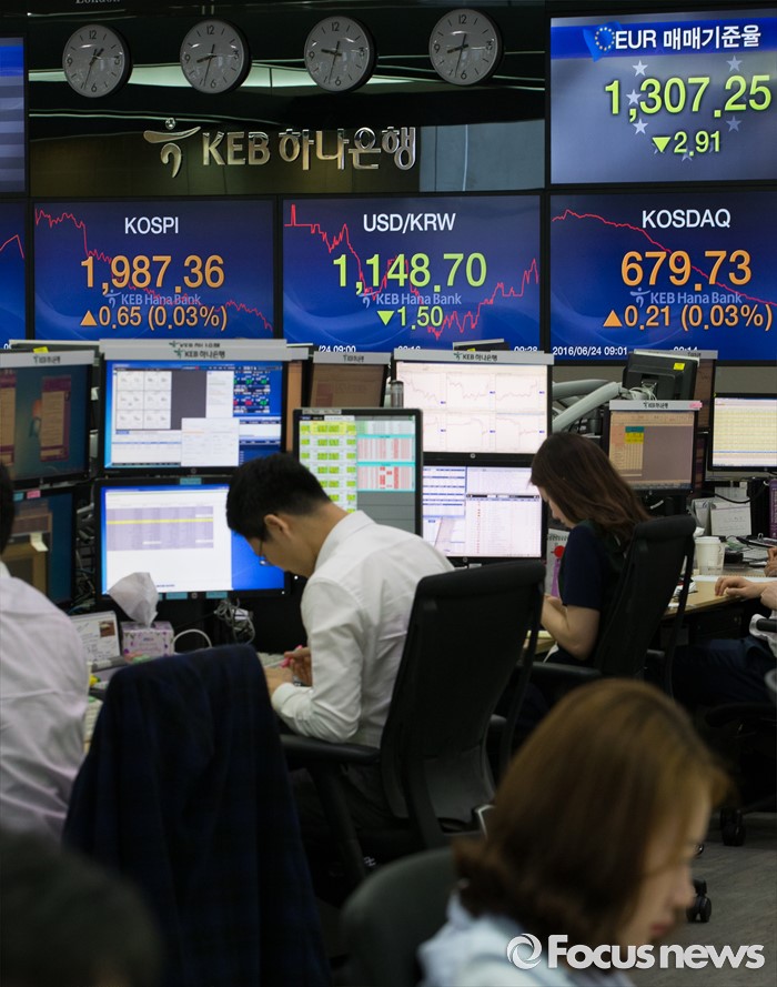 한국 코스닥 시장에서도 지수 급락으로 인한 사이드카가 발동됐다. 올해 코스닥 시장의 사이드카 발동은 지난 2월12일 이후 2번째다.영국의 유럽연합(EU) 탈퇴를 의미하는 '브렉시트' 국민 투표 개표가 진행되는 24일 오전 서울 중구 KEB 하나은행 명동 본점 딜링룸에서 딜러들이 업무를 보고 있다. 이날 코스피지수는 브리메인 기대에 2000p를 돌파했으나 다시 하락해 1900p대를 유지하고 있다. 2016.06.24 이승배 기자
