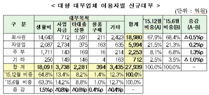 29일 금융위원회, 행정자치부와 금융감독원 등이 개인대부를 주로 취급하는 72개사의 2015년 하반기 신규 대부 취급현황을 분석한 결과 2015년 6월말에 비해 주부들의 이용 비중이 늘었다.