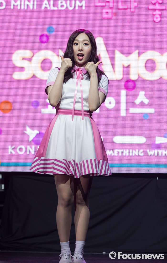 (서울=포커스뉴스) 29일 오전 서울 마포구 예스24 무브홀에서 열린 걸그룹 소나무의 미니앨범 '넘나 좋은 것' 쇼케이스에 참여한 멤버 민재가 포토타임을 갖고 있다.