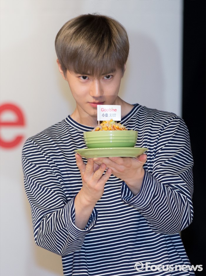 (서울=포커스뉴스) 29일 오후 서울 강남구 일지아트홀에서 열린 '굽네 볼케이노와 함께하는 엑소(EXO) 치밥 쿠킹 팬사인회'에서 수호가 포즈를 취하고 있다.