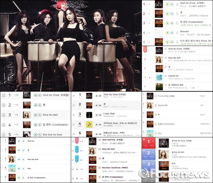 한편 언니쓰는 금일 오후 5시 방송되는 ‘뮤직뱅크’를 통해 데뷔 무대를 가진다.언니쓰 ‘셧 업(Shut Up)’ 음원이 8대 음원차트를 올킬했다. 사진은 앨범 재킷/8대 음원차트 캡처.<사진출처=언니쓰 재킷-KBS/음원차트-멜론,지니,올레뮤직,몽키3,네이버뮤직,엠넷,소리바다,벅스사이트 캡처>