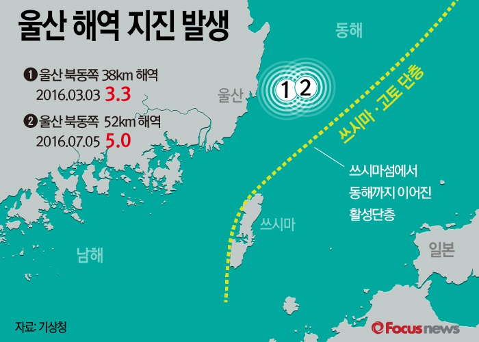 (서울=포커스뉴스) 5일 저녁 8시 33분 울산시 동구 동쪽 52㎞ 떨어진 해역에서 규모 5.0의 지진이 발생했다. 이 지역에서 올해 규모 3.0 이상의 지진이 두 번째로 발생한 것으로 전문가들의 쓰시마-고토 활성 단층대의 영향이라는 분석이 나오고 있다.