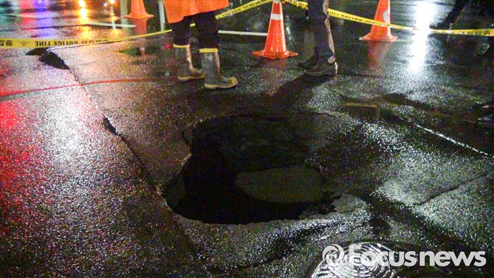 (서울=포커스뉴스) 6일 서울 송파경찰서와 소방당국은 전날 오후 11시경 서울 송파구 신천동 파크리오아파트 사거리 도로에서 지름 1.5m, 깊이 1.4m 크기의 지반침하 현상(싱크홀)이 발견됐다고 밝혔다. 이곳은 제2롯데월드와 한 블럭 떨어진 곳으로 작년과 재작년에도 이 일대에서 싱크홀이 잇따라 발생했다. <사진제공= 송파소방서>