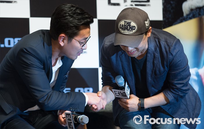 (서울=포커스뉴스) 7일 오전 서울 강남구 압구정 CGV에서 열린 영화 '터널' 제작보고회에 참석한 배우 하정우(본명 김성훈)과 김성훈 감독이 악수하고 있다.