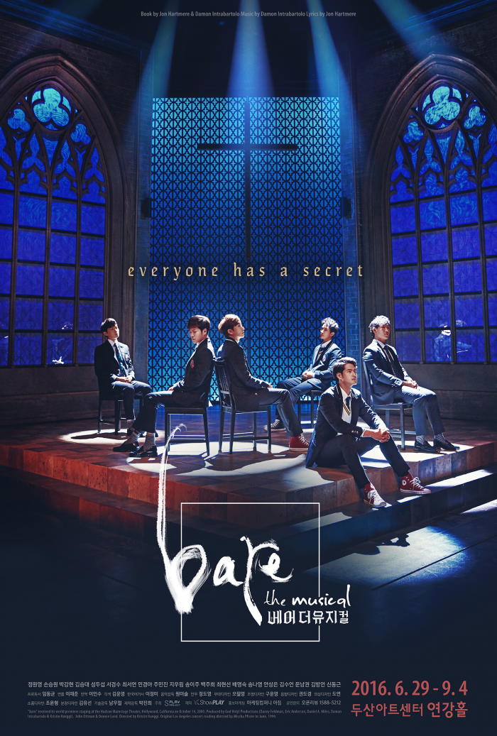 '베어 더 뮤지컬'의 메인 포스터는 보수적인 카톨릭계 고등학교를 상징하는 무대 중앙의 십자가를 중심으로 양쪽의 커다란 창문이 한눈에 들어온다. 이 배경 앞에 피터와 제이슨으로 열연중인 주연 6명이 한 공간에 모여 서로 다른 곳을 응시하며 앉아있는 모습이 눈에 띈다. 그들의 엇갈린 시선과 담담한 표정은 현실에서 외면 받는 주인공들의 고민과 아픔, 불안한 심리를 표현한다.