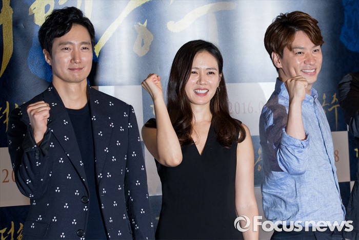 (서울=포커스뉴스) 27일 오후 서울 광진구 롯데시네마 건대입구점에서 열린 영화 '덕혜옹주' 언론 시사회에 참석한 배우 박해일(왼쪽부터), 손예진, 정상훈이 포즈를 취하고 있다.