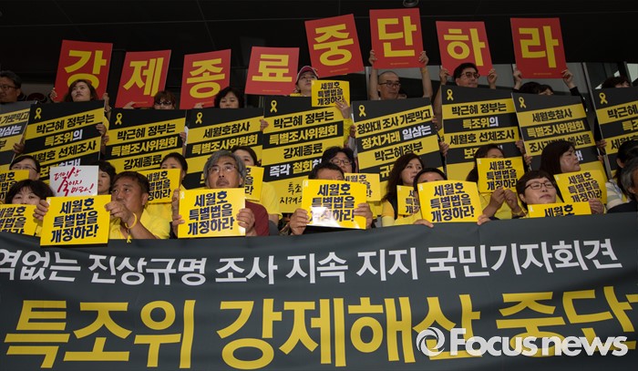 해수부는 지난달 세월호 선수를 2.2도(높이 약 4m) 가량 들어 올리는 데 성공했으나 다음 날 새벽 파고 2m의 강한 너울이 밀려오는 등 기상 악화로 수차례 작업을 연기해왔다.(서울=포커스뉴스) 지난 1일 오전 서울 중구 나라키움저동빌딩 앞에서 열린 '세월호 특조위 성역없는 진상규명 조사 지속 지지 기자회견'에 참석한 416가족협의회와 4.16연대 회원들이 세월호 특별법 개정을 요구하는 손팻말을 들고 있다. 2016.07.01 양지웅 기자 (서울=포커스뉴스) 지난 1일 오전 서울 중구 나라키움저동빌딩 앞에서 열린 '세월호 특조위 성역없는 진상규명 조사 지속 지지 기자회견'에 참석한 416가족협의회와 4.16연대 회원들이 세월호 특별법 개정을 요구하는 손팻말을 들고 있다. 2016.07.01 양지웅 기자 (서울=포커스뉴스) 지난 1일 오전 서울 중구 나라키움저동빌딩 앞에서 열린 '세월호 특조위 성역없는 진상규명 조사 지속 지지 기자회견'에 참석한 416가족협의회와 4.16연대 회원들이 세월호 특별법 개정을 요구하는 손팻말을 들고 있다. 2016.07.01 양지웅 기자
