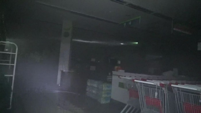 경찰과 소방당국은 불이 1층 천장 전선케이블을 따라 번진 것을 토대로 한전과 정확한 화재 원인을 조사하고 있다.서울 광진소방서에 따르면 30일 오후 6시5분쯤 서울 광장동 식자재 마트 식품 창고 천장에서 발생한 불은 2층까지 번졌다. 2016.07.30. <사진출처=서울 광진소방서 제공 화면 캡처>