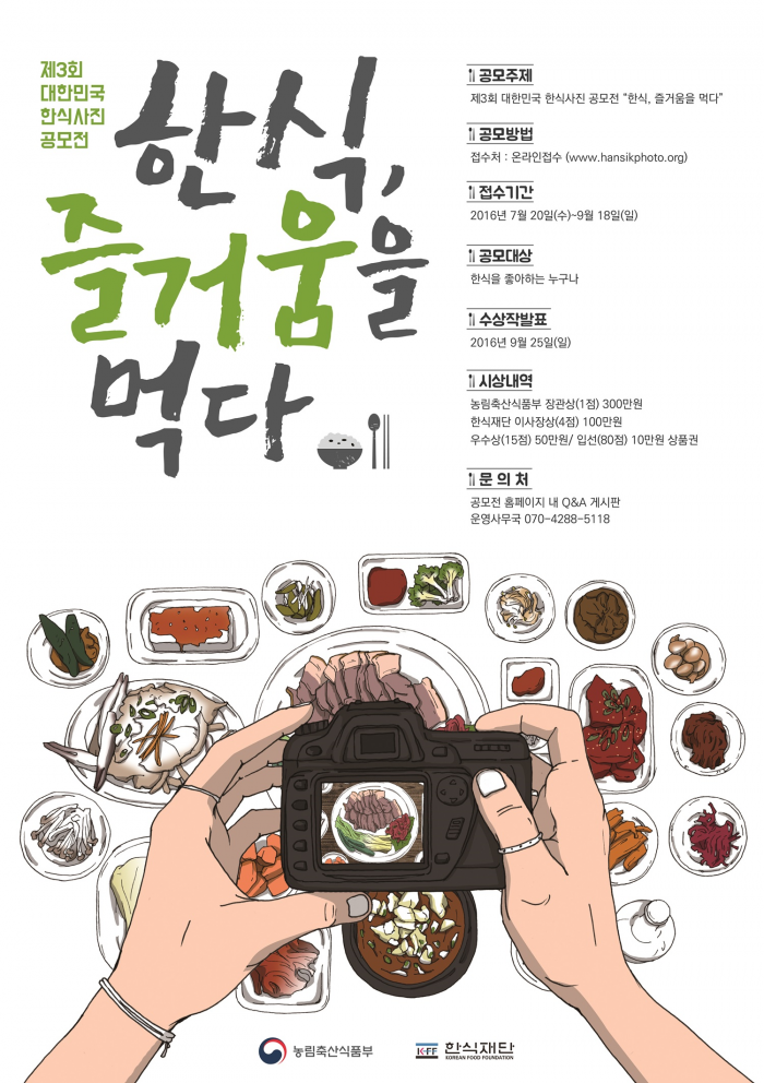 (서울=포커스뉴스) 농림축산식품부가 주최하고 한식재단이 주관하는 '제3회 대한민국 한식사진 공모전'이 '한식, 즐거움을 먹다'라는 주제로 개최된다.