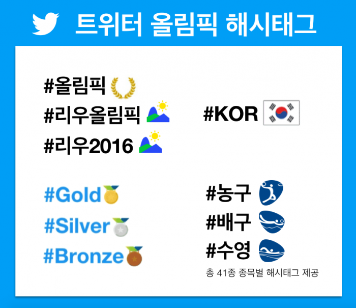 전세계 스포츠 팬이라면 누구나 다양한 특별 이모티콘을 활용해 올림픽 관련 트윗을 작성하며 올림픽을 즐길 수 있다. 내전 등으로 모국을 떠난 난민 선수들로 구성된 난민팀(Refugee Olympic Team, #ROT)을 포함한 총 207개 참가국의 알파벳 세 글자 국가 코드를 '샵(#)' 기호와 함께 해시태그로 입력하면 각국의 국기가 자동으로 나타난다. 예를 들어 '#KOR'과 함께 트윗을 작성하면 트윗에 태극기 이모티콘이 노출된다.