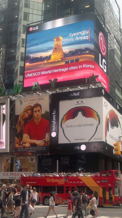 문화재청은 LG전자가 보유한 미국 뉴욕 타임스퀘어 전광판을 활용해 8월과 11월에 각각 1개월씩 한국 세계유산을 홍보하는 홍보 영상물을 상영한다. 해당 영상물은 1일 40회 이상 노출된다.