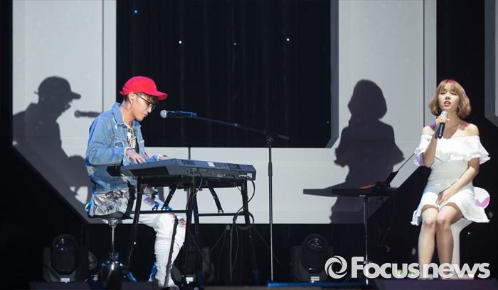 (서울=포커스뉴스) 8일 오후 서울 광진구 예스24 라이브홀에서 첫 솔로 미니앨범을 발표한 가수 준케이(왼쪽)가 백아연과 무대를 선보이고 있다.