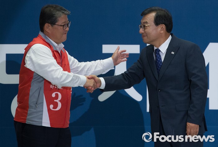 | △ 악수하는 이정현-조원진 |