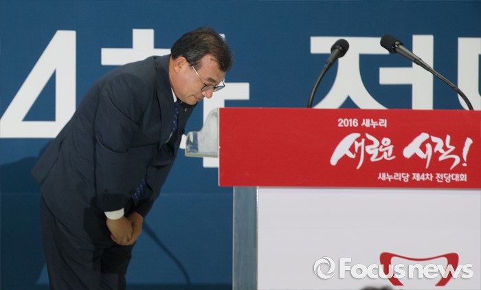 (서울=포커스뉴스) 9일 오후 서울 송파구 잠실실내체육관에서 열린 새누리당 4차 전당대회에 참석한 이정현 의원이 당대표로 선출된 후 수락연설에 앞서 인사하고 있다.