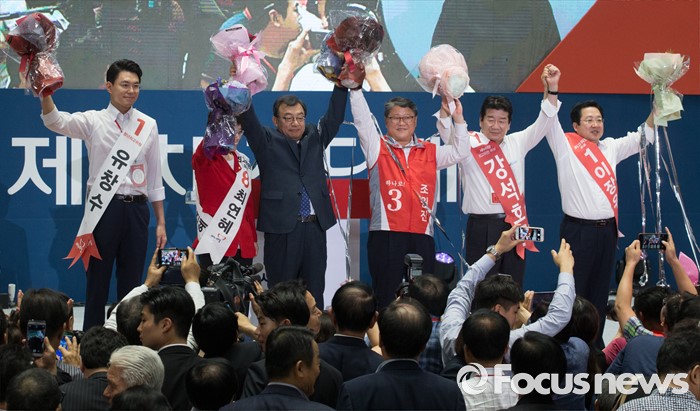 (서울=포커스뉴스) 9일 오후 서울 송파구 잠실실내체육관에서 열린 새누리당 4차 전당대회에서 당대표로 선출된 이정현 의원과 신임 최고위원들이 손을 들어 인사하고 있다. 왼쪽부터 유창수, 최연혜 신임 최고위원, 이정현 신임 대표, 조원진, 강석호, 이장우 신임 최고위원.