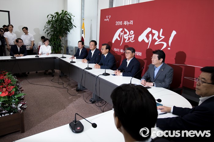 (서울=포커스뉴스) 이정현 새누리당 대표가 11일 오전 서울 여의도 국회에서 열린 최고위원회의에 참석해 취재진에게 지도부를 비롯한 최고위원의 모두발언 공개 없이 비공개 회의로 전환한다고 설명 하고 있다.