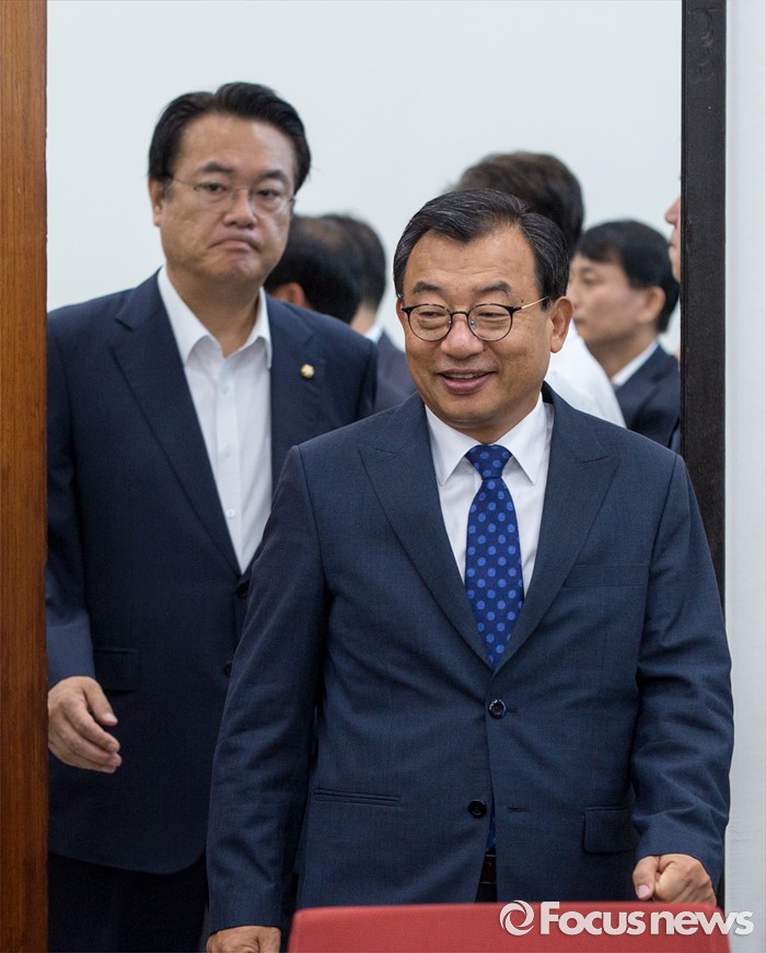 (서울=포커스뉴스) 이정현 새누리당 대표와 정진석 원내대표가 11일 오전 서울 여의도 국회에서 열린 최고위원회의에 참석하기 위해 회의실로 들어서고 있다. 이날 회의에서 대표와 원내대표를 비롯한 최고위원들의 모두발언 공개 없이 잠깐의 촬영시간만 주어진 뒤 비공개로 전환 했다.